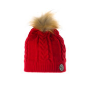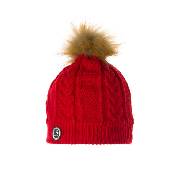 Children´s hat with fleece lining, knitted from soft yarn. Faux fur pompom. Reflective Huppa logo on the hat.