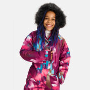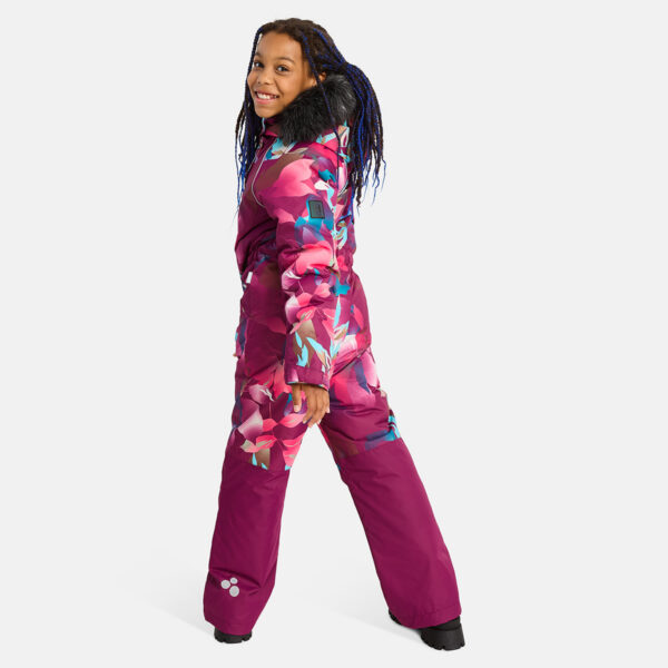 Children’s waterproof and windproof overall. Breathable fabric. Soft lining fabric on the inside. Removable snap-on hood. Integrated adjustable elastic band around the hood and on the back. Ribbed cuffs at sleeve ends. Adjustable sleeve ends. Lapped zipper at front. Integrated zipper pockets at front. Buttonhole-adjustable waist. Snow gaiters at leg ends. Drawstring tunnel with stoppers at leg ends. Waterproof taped seams. Removable faux fur trim on hood. Reflective elements on fabric.