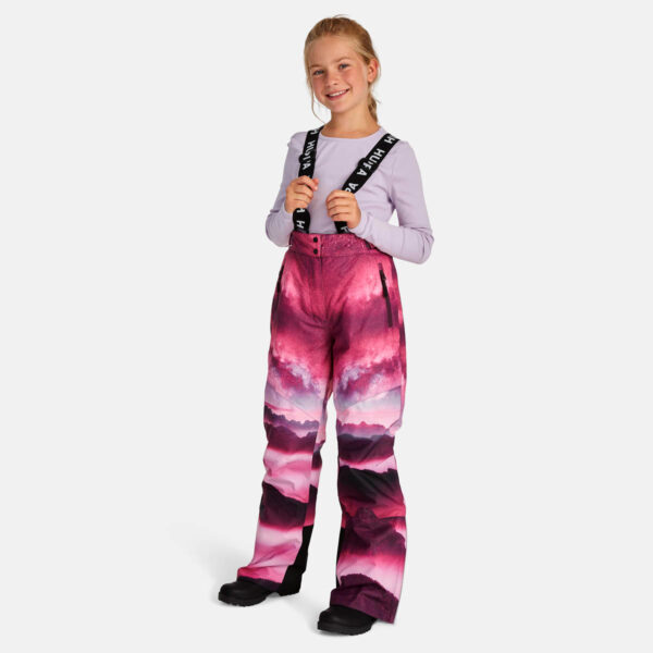 Children’s waterproof and windproof pants. Breathable fabric. Soft mesh lining on the inside of the pants. Adjustable removable braces. Adjustable waist. Integrated elastic band at the back of the waist. Integrated zippered pockets. Snow gaiters at leg ends. Zipper-adjustable leg end width. Waterproof taped seams. Reflective elements at the bottom.