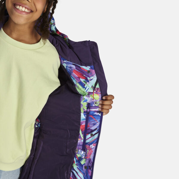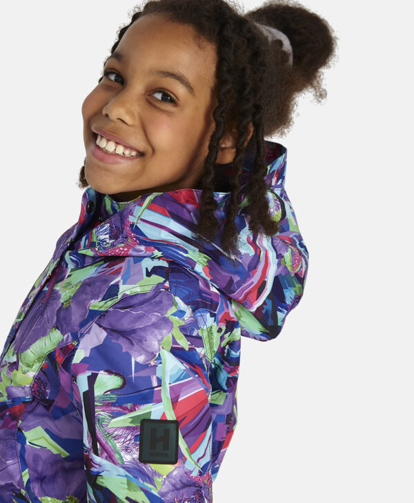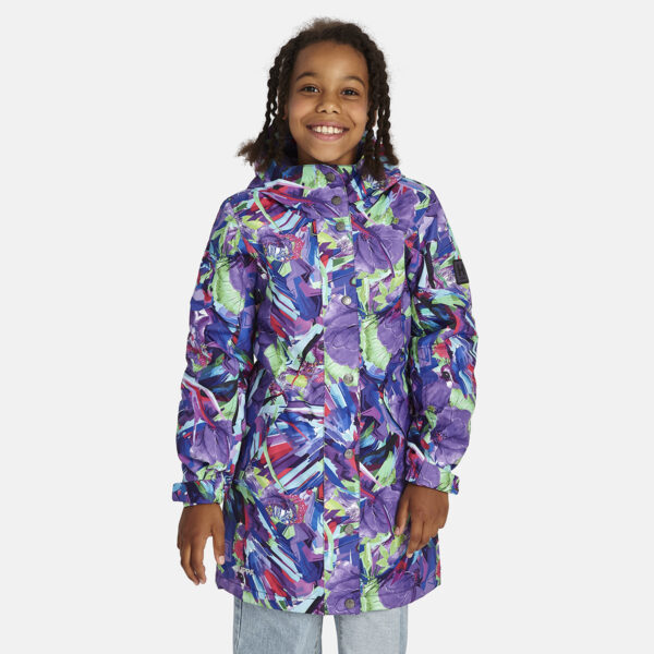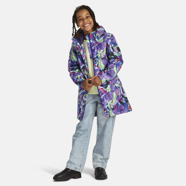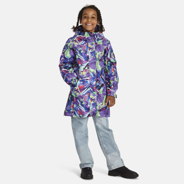 Children’s waterproof and windproof between-seasons parka Breathable fabric Adjustable hood and sleeve ends Drawstring tunnel with stoppers on waist Waterproof taped seams Reflective elements on fabric