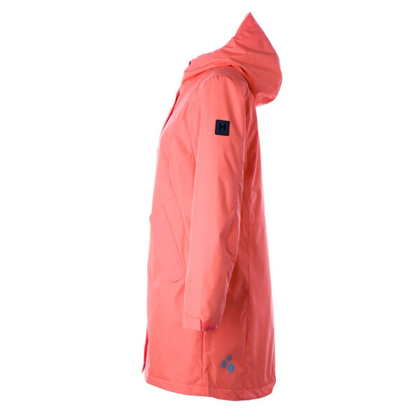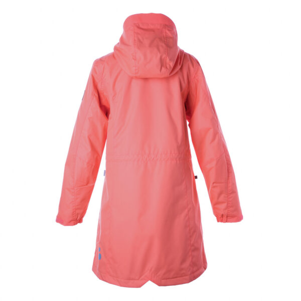 Insulated (40 g) water- and windproof parka for girls, suitable for spring and autumn. The top layer of the parka is made of a breathable material. It has an adjustable hood and sleeve ends, as well as an adjustable waist with stoppers. It has waterproof, taped seams and is decorated with reflective details.