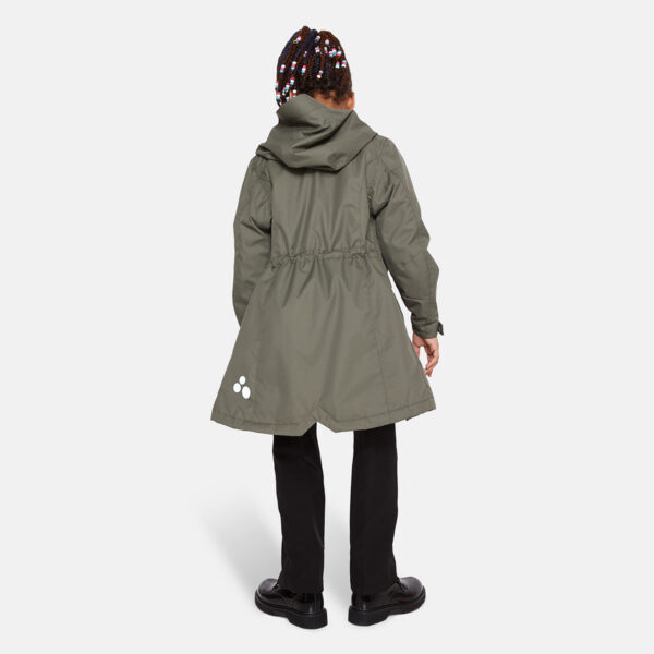 Insulated (40 g) water- and windproof parka for girls, suitable for spring and autumn. The top layer of the parka is made of a breathable material. It has an adjustable hood and sleeve ends, as well as an adjustable waist with stoppers. It has waterproof, taped seams and is decorated with reflective details.