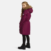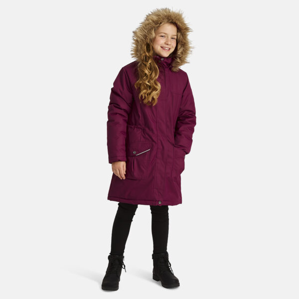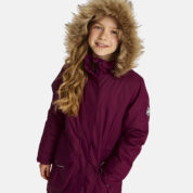 Children’s waterproof and windproof winter parka. Breathable fabric. Soft lining on the insid.e Removable snap-on hood. Ribbed cuffs at sleeve ends. Drawstring tunnel with stoppers on waist. Waterproof taped seams. Faux fur trim on hood. Reflective elements on fabric.