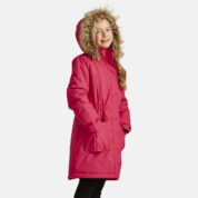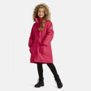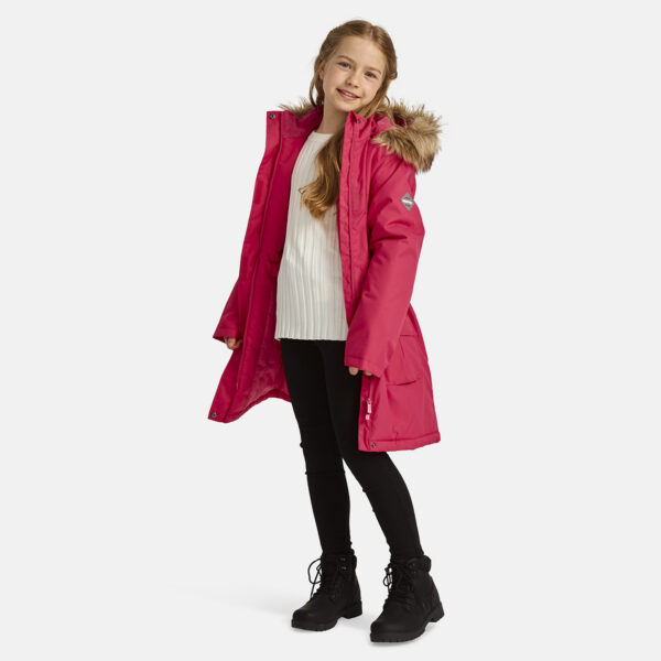Children’s waterproof and windproof winter parka. Breathable fabric. Soft lining on the insid.e Removable snap-on hood. Ribbed cuffs at sleeve ends. Drawstring tunnel with stoppers on waist. Waterproof taped seams. Faux fur trim on hood. Reflective elements on fabric.