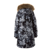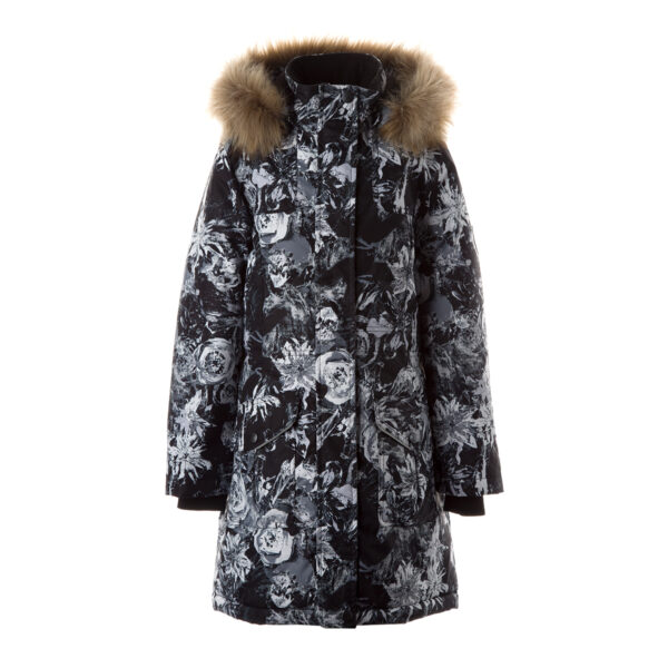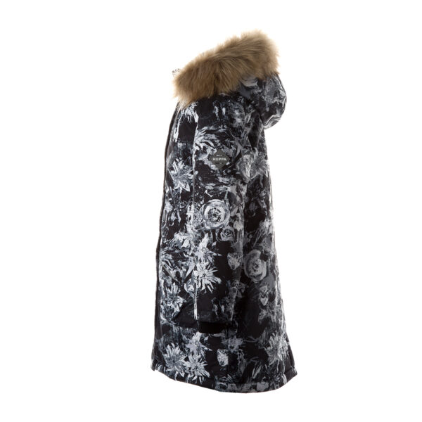 Children’s waterproof and windproof winter parka. Breathable fabric. Soft lining on the insid.e Removable snap-on hood. Ribbed cuffs at sleeve ends. Drawstring tunnel with stoppers on waist. Waterproof taped seams. Faux fur trim on hood. Reflective elements on fabric.