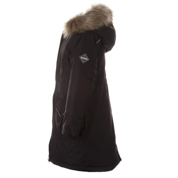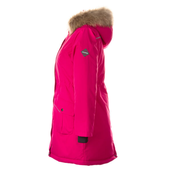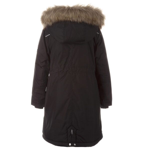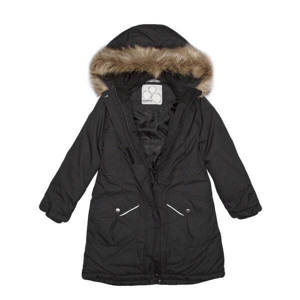 Children’s waterproof and windproof winter parka. Breathable fabric. Soft lining on the insid.e Removable snap-on hood. Ribbed cuffs at sleeve ends. Drawstring tunnel with stoppers on waist. Waterproof taped seams. Faux fur trim on hood. Reflective elements on fabric.