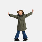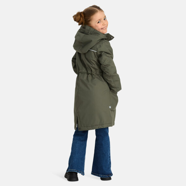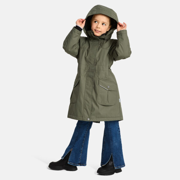 Girls´ waterproof and windproof between-seasons parka. Breathable fabric. Soft lining on the inside. Removable snap-on hood. Ribbed cuffs at sleeve ends. Drawstring tunnel with stoppers on waist. Waterproof taped seams. Reflective elements on fabric.