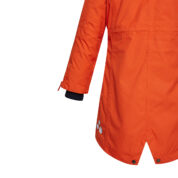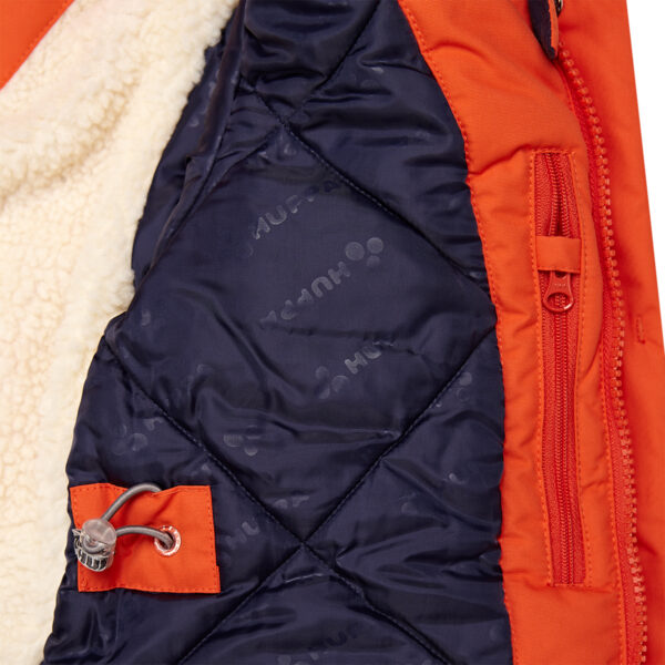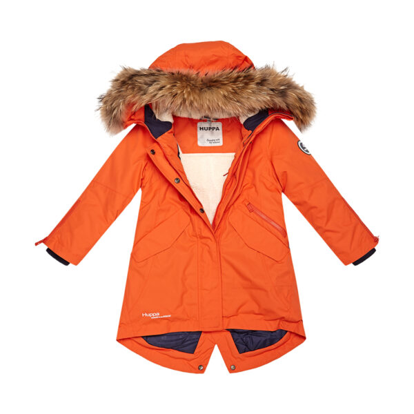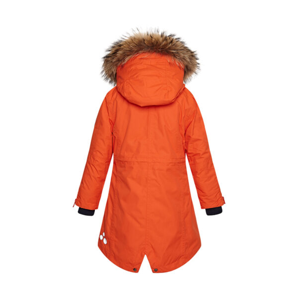 Children’s waterproof and windproof winter parka. Breathable fabric. Soft fabric on the inside. Faux sheepskin lining at the top of the back and inside the hood. Adjustable hood. Ribbed cuffs at sleeve ends. Two-way zipper covered with stud-press flap at front. Magnetic fastening on flap pockets. Drawstring tunnel with stoppers on waist. Waterproof taped seams. Removable natural fur trim on hood. Reflective elements on fabric.
