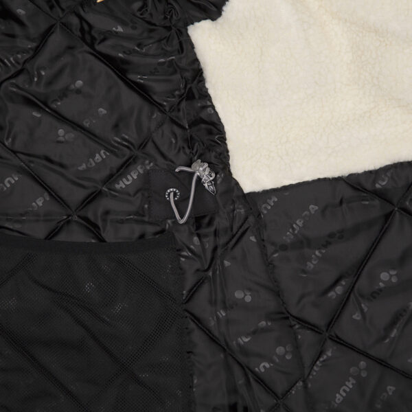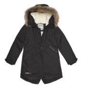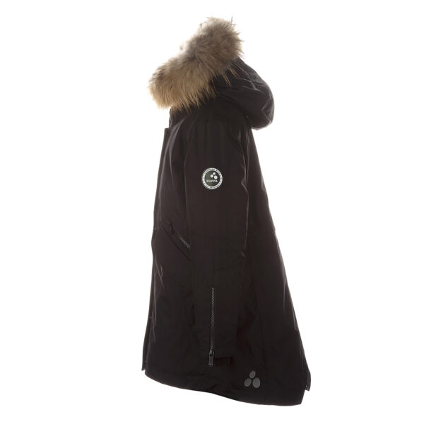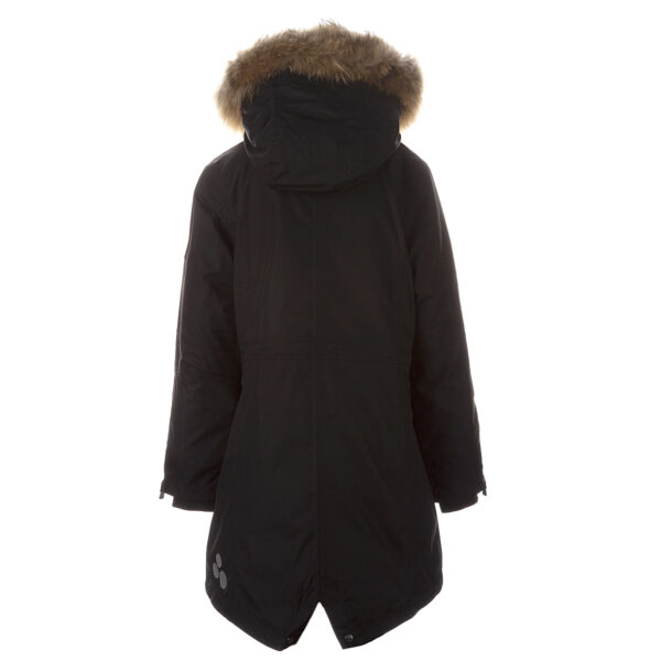 Bērnu ūdens un vēja necaurlaidīga ziemas jaka Gaisu caurlaidīgs virsējais audums Jakas odere no mīksta auduma Muguras augšdaļā un kapuces iekšējos sānos jērādas imitācijas odere Regulējama kapuce Rievotas piedurknes Priekšpusē apšūts divvirziena rāvējslēdzējs Magnētiski aizdarāmas kabatas Jostas vietā aizdare ar stoperi, jostasvieta regulējama no iekšpuses Ūdens necaurlaidīgi līmēti izšuvumi Kapucei noņemama dabīgās kažokādas mala Auduma virspusē atstarojošas detaļas