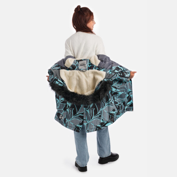 Children´s waterproof and windproof winter parka with 200g insulation. The breathable outer fabric and soft inner lining ensure all-day wearability, while faux sheepskin adds extra warmth at the top of the back and inside the hood. Functional details include ribbed sleeve cuffs, a two-way front zipper covered with a stud-press flap, and magnetic fastenings on the flap pockets. A drawstring tunnel with stoppers at the waist allows for an adjustable fit, while taped waterproof seams provide reliable protection. The hood features a removable faux fur trim, and reflective elements on the fabric improve visibility in low light. A hidden pocket under the front placket completes the design with a practical touch.