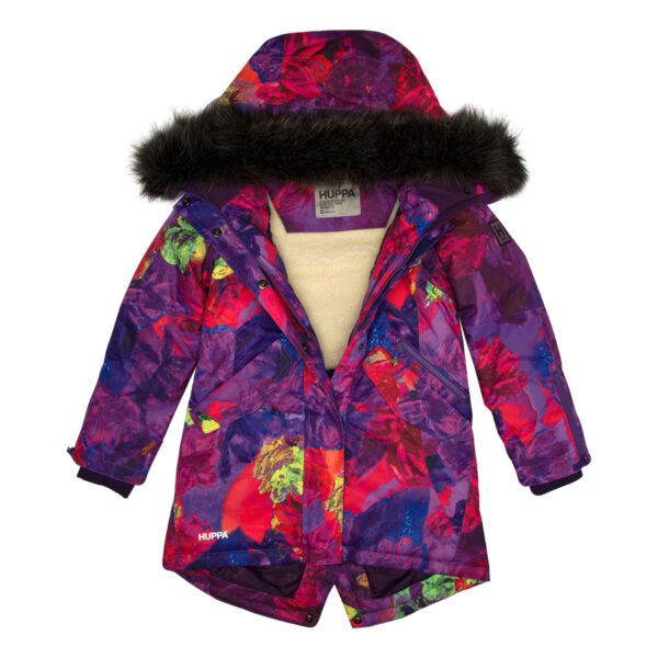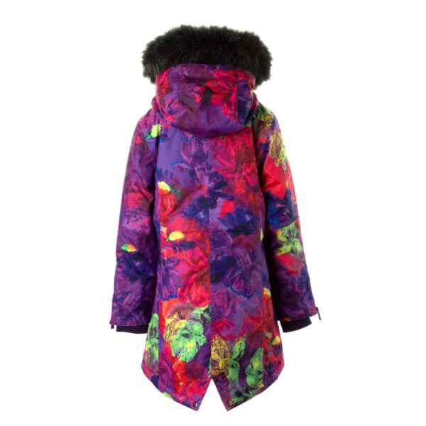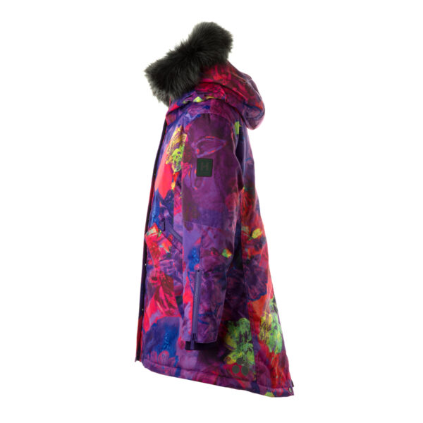 Children’s waterproof and windproof winter parka. Breathable fabric. Soft fabric on the inside. Faux sheepskin lining at the top of the back and inside the hood. Adjustable hood. Ribbed cuffs at sleeve ends. Two-way zipper covered with stud-press flap at front. Magnetic fastening on flap pockets. Drawstring tunnel with stoppers on waist. Waterproof taped seams. Removable faux fur trim on hood. Reflective elements on fabric.