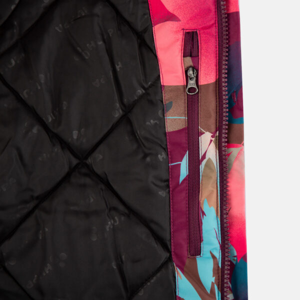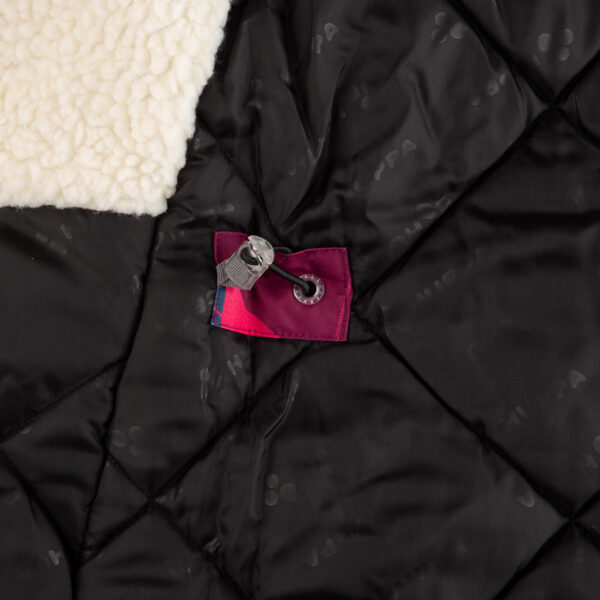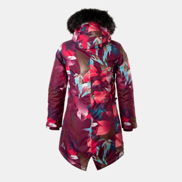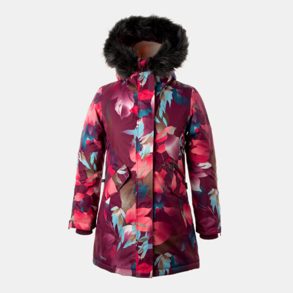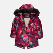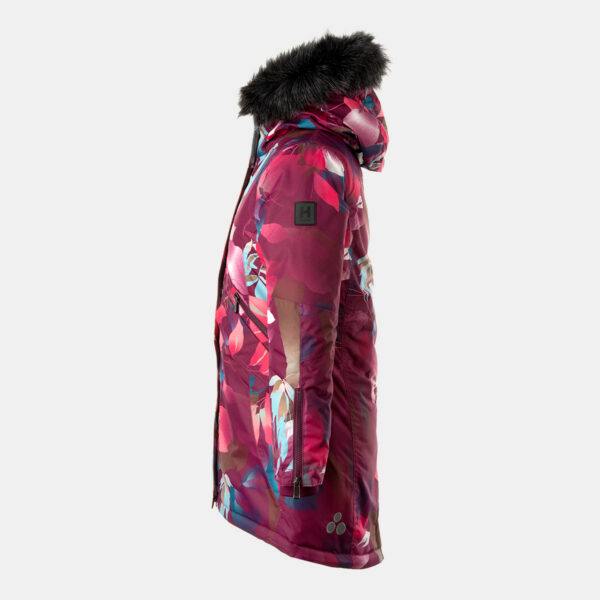 Children’s waterproof and windproof winter parka. Breathable fabric. Soft fabric on the inside. Faux sheepskin lining at the top of the back and inside the hood. Adjustable hood. Ribbed cuffs at sleeve ends. Two-way zipper covered with stud-press flap at front. Magnetic fastening on flap pockets. Drawstring tunnel with stoppers on waist. Waterproof taped seams. Removable faux fur trim on hood. Reflective elements on fabric.