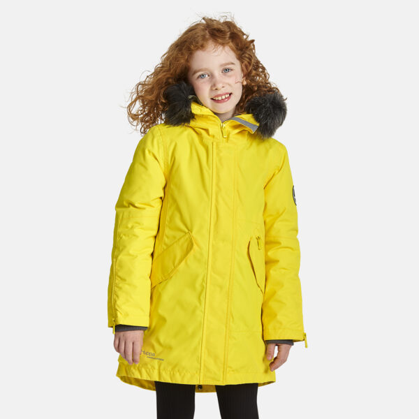 Children’s waterproof and windproof winter parka. Breathable fabric. Soft fabric on the inside. Faux sheepskin lining at the top of the back and inside the hood. Adjustable hood. Ribbed cuffs at sleeve ends. Two-way zipper covered with stud-press flap at front. Magnetic fastening on flap pockets. Drawstring tunnel with stoppers on waist. Waterproof taped seams. Removable faux fur trim on hood. Reflective elements on fabric.