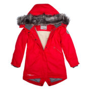 Children’s waterproof and windproof winter parka. Breathable fabric. Soft fabric on the inside. Faux sheepskin lining at the top of the back and inside the hood. Adjustable hood. Ribbed cuffs at sleeve ends. Two-way zipper covered with stud-press flap at front. Magnetic fastening on flap pockets. Drawstring tunnel with stoppers on waist. Waterproof taped seams. Removable faux fur trim on hood. Reflective elements on fabric.