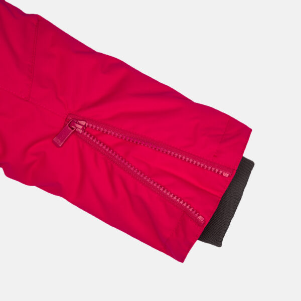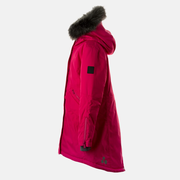 Children’s waterproof and windproof winter parka. Breathable fabric. Soft fabric on the inside. Faux sheepskin lining at the top of the back and inside the hood. Adjustable hood. Ribbed cuffs at sleeve ends. Two-way zipper covered with stud-press flap at front. Magnetic fastening on flap pockets. Drawstring tunnel with stoppers on waist. Waterproof taped seams. Removable faux fur trim on hood. Reflective elements on fabric.