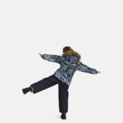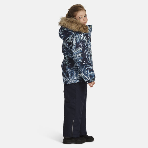 Children’s jacket and pants set. Waterproof and windproof, breathable top fabric. Soft mesh lining on the inside of the jacket and pants. Integrated elastic band at sleeve ends and on the waist. Removable snap-on hood Faux fur trim on hood. The bib pants have elastic adjustable braces. Integrated elastic band on waist. Drawstring tunnel with stoppers at leg ends. Waterproof taped seams. The pants have no inner leg seam. Reflective elements on both jacket and pants.