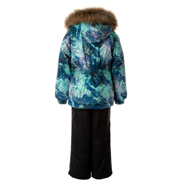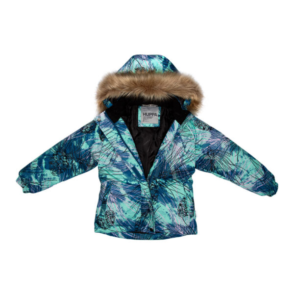 Children’s jacket and pants set. Waterproof and windproof, breathable top fabric. Soft mesh lining on the inside of the jacket and pants. Integrated elastic band at sleeve ends and on the waist. Removable snap-on hood Faux fur trim on hood. The bib pants have elastic adjustable braces. Integrated elastic band on waist. Drawstring tunnel with stoppers at leg ends. Waterproof taped seams. The pants have no inner leg seam. Reflective elements on both jacket and pants.