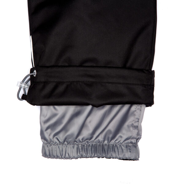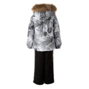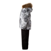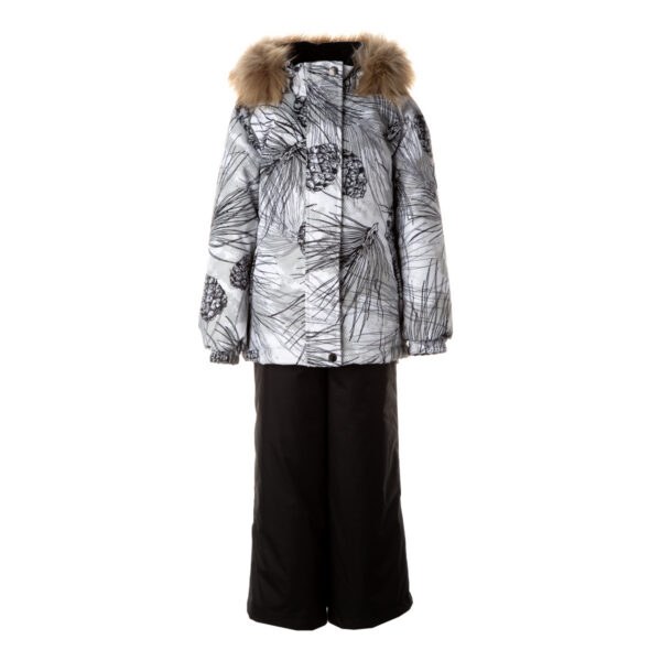 Children’s jacket and pants set. Waterproof and windproof, breathable top fabric. Soft mesh lining on the inside of the jacket and pants. Integrated elastic band at sleeve ends and on the waist. Removable snap-on hood Faux fur trim on hood. The bib pants have elastic adjustable braces. Integrated elastic band on waist. Drawstring tunnel with stoppers at leg ends. Waterproof taped seams. The pants have no inner leg seam. Reflective elements on both jacket and pants.
