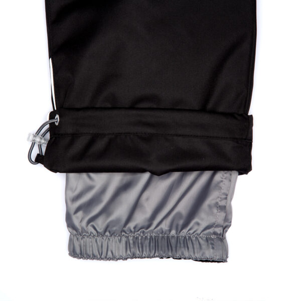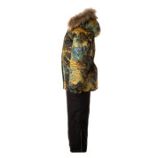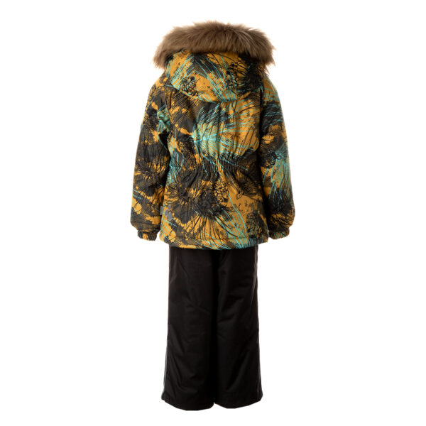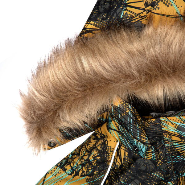 Bērnu jakas un bikšu komplekts Ūdens un vēja necaurlaidīgs, gaisu caurlaidīgs virsējais audums Jakas un bikšu odere no mīksta auduma Piedurknēs iestrādāta gumijas apdare Noņemamā kapuce pie apkakles piestiprināma ar velkro aizdari Kapucei noņemama mākslīgās kažokādas mala Biksēm ir augstā vidukļa daļa un regulējamas, elastīgas lences Vidukļa daļā un starās iestrādāta gumijas apdare Ūdens necaurlaidīgi līmēti izšuvumi Biksēm komplektā elastīgas pazoles Kā jakai, tā arī biksēm ir atstarojošas detaļas