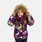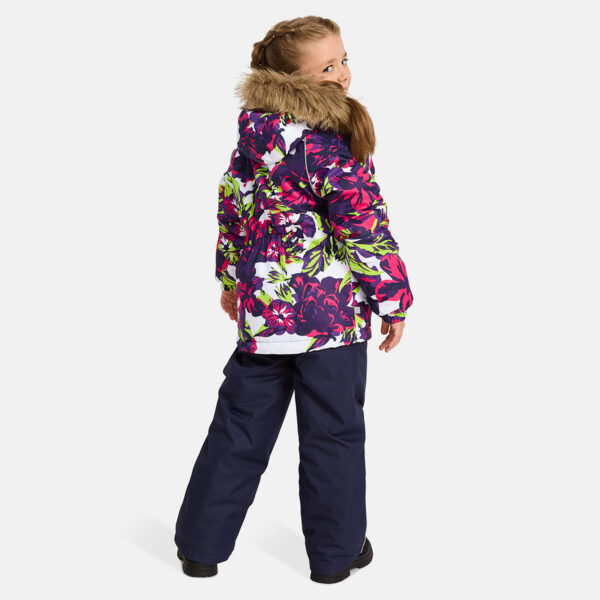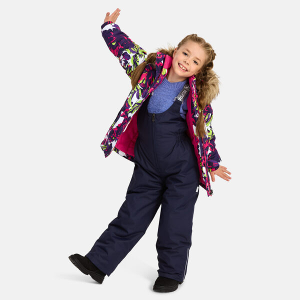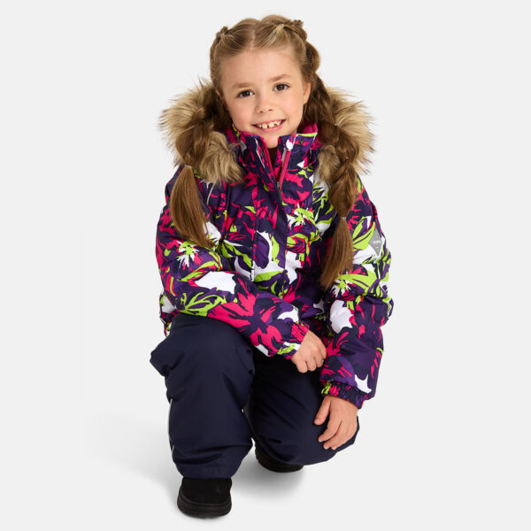 Children’s jacket and pants set. Waterproof and windproof, breathable top fabric. Soft mesh lining on the inside of the jacket and pants. Integrated elastic band at sleeve ends and on the waist. Removable snap-on hood Faux fur trim on hood. The bib pants have elastic adjustable braces. Integrated elastic band on waist. Drawstring tunnel with stoppers at leg ends. Waterproof taped seams. The pants have no inner leg seam. Reflective elements on both jacket and pants.