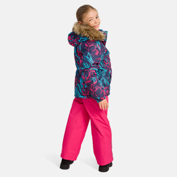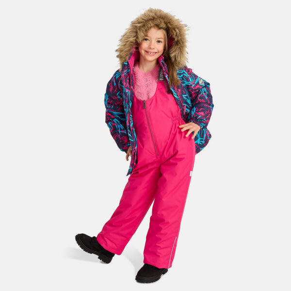 Children’s jacket and pants set. Waterproof and windproof, breathable top fabric. Soft mesh lining on the inside of the jacket and pants. Integrated elastic band at sleeve ends and on the waist. Removable snap-on hood Faux fur trim on hood. The bib pants have elastic adjustable braces. Integrated elastic band on waist. Drawstring tunnel with stoppers at leg ends. Waterproof taped seams. The pants have no inner leg seam. Reflective elements on both jacket and pants.