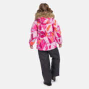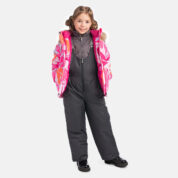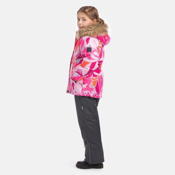 Children’s jacket and pants set. Waterproof and windproof, breathable top fabric. Soft mesh lining on the inside of the jacket and pants. Integrated elastic band at sleeve ends and on the waist. Removable snap-on hood Faux fur trim on hood. The bib pants have elastic adjustable braces. Integrated elastic band on waist. Drawstring tunnel with stoppers at leg ends. Waterproof taped seams. The pants have no inner leg seam. Reflective elements on both jacket and pants.