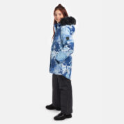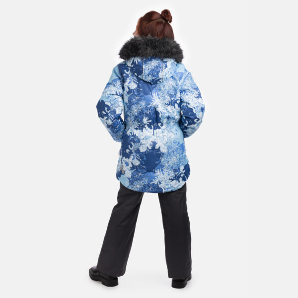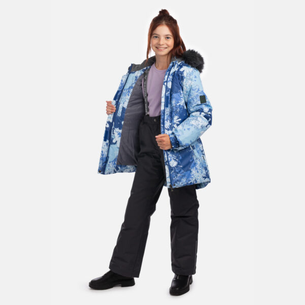 Children’s jacket and pants set. Waterproof and windproof, breathable top fabric. Soft mesh lining on the inside of the jacket and pants. Integrated elastic band at sleeve ends and on the waist. Removable snap-on hood. Removable faux fur trim on hood. The bib pants have elastic adjustable braces. Integrated elastic band on waist. Snow gaiters at leg ends. Drawstring tunnel with stoppers at leg ends. Waterproof taped seams. The pants have no inner leg seam. Reflective elements on both jacket and pants.