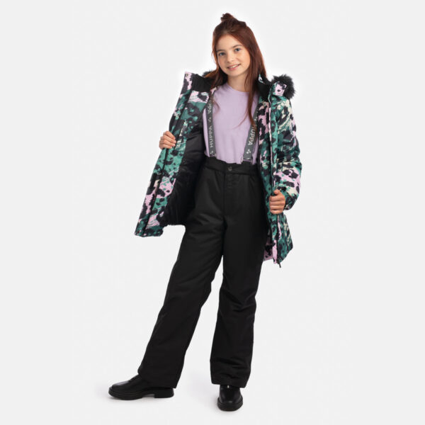 Children’s jacket and pants set. Waterproof and windproof, breathable top fabric. Soft mesh lining on the inside of the jacket and pants. Integrated elastic band at sleeve ends and on the waist. Removable snap-on hood. Removable faux fur trim on hood. The bib pants have elastic adjustable braces. Integrated elastic band on waist. Snow gaiters at leg ends. Drawstring tunnel with stoppers at leg ends. Waterproof taped seams. The pants have no inner leg seam. Reflective elements on both jacket and pants.