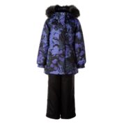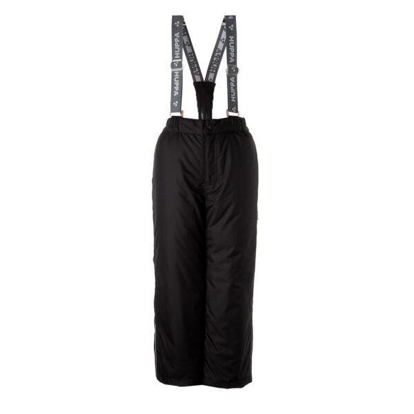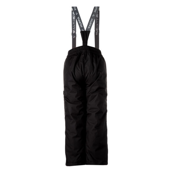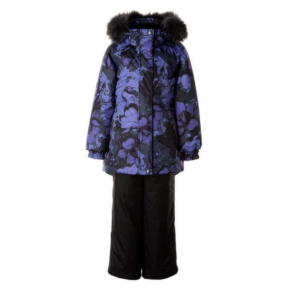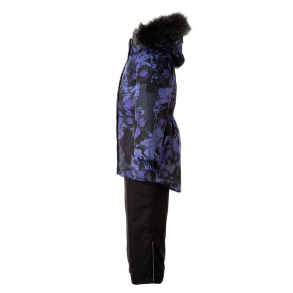 Children’s jacket and pants set. Waterproof and windproof, breathable top fabric. Soft mesh lining on the inside of the jacket and pants. Integrated elastic band at sleeve ends and on the waist. Removable snap-on hood. Removable faux fur trim on hood. The pants have removable elastic and adjustable braces. Integrated elastic band on waist. Snow gaiters at leg ends. Drawstring tunnel with stoppers at leg ends. Waterproof taped seams. Reflective elements on both jacket and pants.