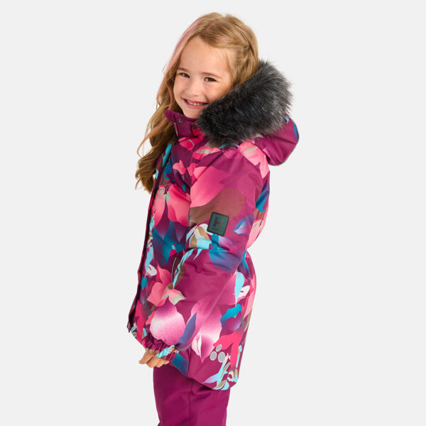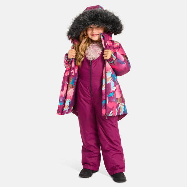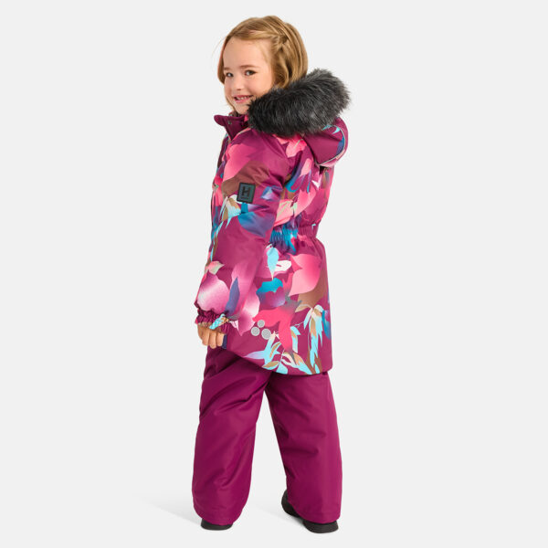 Vaikiškas striukės ir kelnių komplektas. Neperšlampamas ir neperpučiamas, orui laidus viršutinis audinys. Striukės ir kelnių vidinė pusė iš minkšto pamušalinio audinio. Rankovių apačioje ir ant juosmens įsiūta guminė juostelė. Nuimamas gobtuvas prie apykaklės prisegamas kibiu lipduku. Gobtuvas apkraštuotas nuimamu dirbtiniu kailiu. Kelnės aukštesniu liemeniu ir turi reguliuojamas elastines petnešas. Juosmenyje įsiūta guminė juostelė. Klešnių apačioje apsaugos nuo sniego. Klešnių apačioje įsiūta guminė juostelė su fiksatoriais. Vandeniui atsparios klijuotos siūlės. Kelnėse nėra klešnių vidinės siūlės. Ant striukės ir kelnių šviesą atspindinčios detalės.