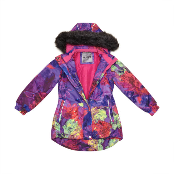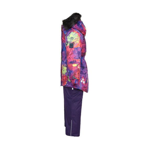Children’s jacket and pants set. Waterproof and windproof, breathable top fabric. Soft mesh lining on the inside of the jacket and pants. Integrated elastic band at sleeve ends and on the waist. Removable snap-on hood. Removable faux fur trim on hood. The pants have removable elastic and adjustable braces. Integrated elastic band on waist. Snow gaiters at leg ends. Drawstring tunnel with stoppers at leg ends. Waterproof taped seams. Reflective elements on both jacket and pants.