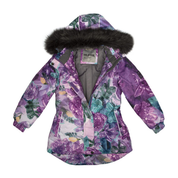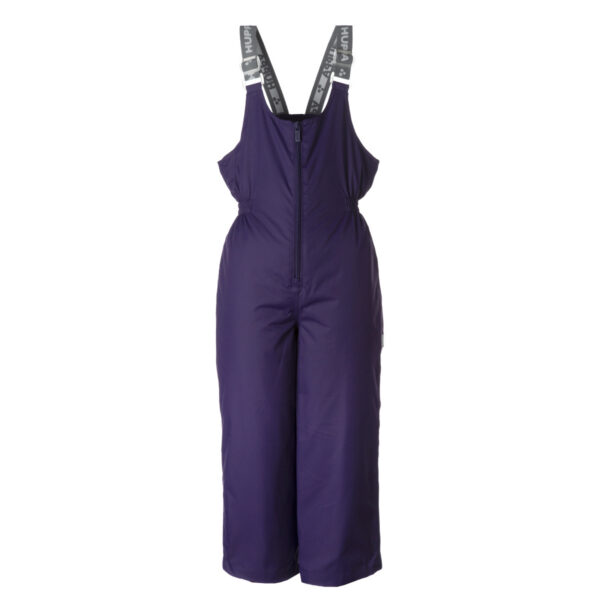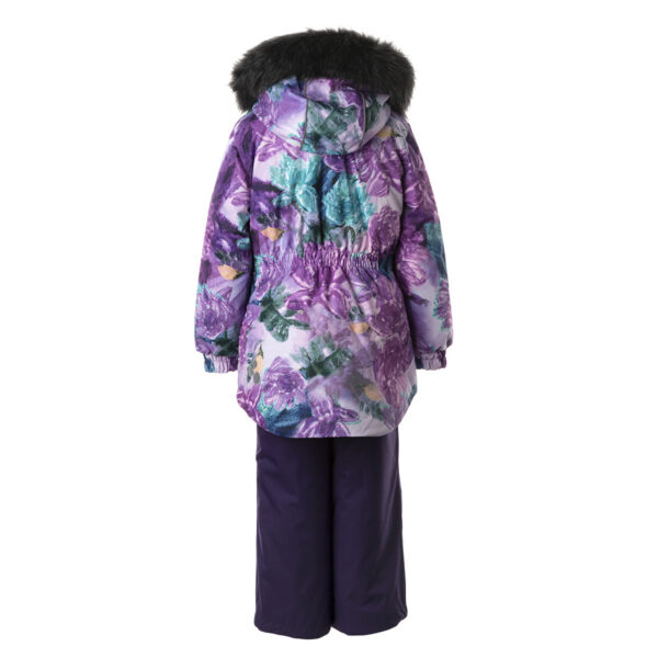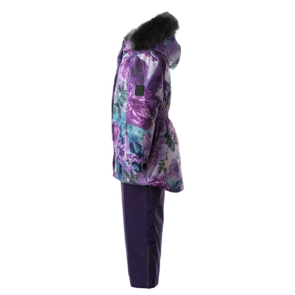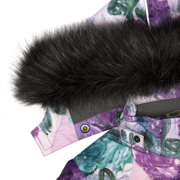 Children’s jacket and pants set. Waterproof and windproof, breathable top fabric. Soft mesh lining on the inside of the jacket and pants. Integrated elastic band at sleeve ends and on the waist. Removable snap-on hood. Removable faux fur trim on hood. The pants have removable elastic and adjustable braces. Integrated elastic band on waist. Snow gaiters at leg ends. Drawstring tunnel with stoppers at leg ends. Waterproof taped seams. Reflective elements on both jacket and pants.