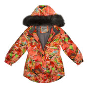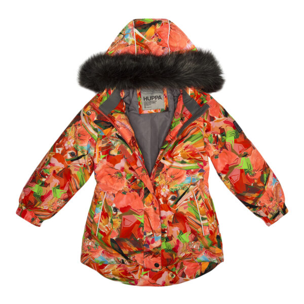 Children’s jacket and pants set. Waterproof and windproof, breathable top fabric. Soft mesh lining on the inside of the jacket and pants. Integrated elastic band at sleeve ends and on the waist. Removable snap-on hood. Removable faux fur trim on hood. The pants have removable elastic and adjustable braces. Integrated elastic band on waist. Snow gaiters at leg ends. Drawstring tunnel with stoppers at leg ends. Waterproof taped seams. Reflective elements on both jacket and pants.