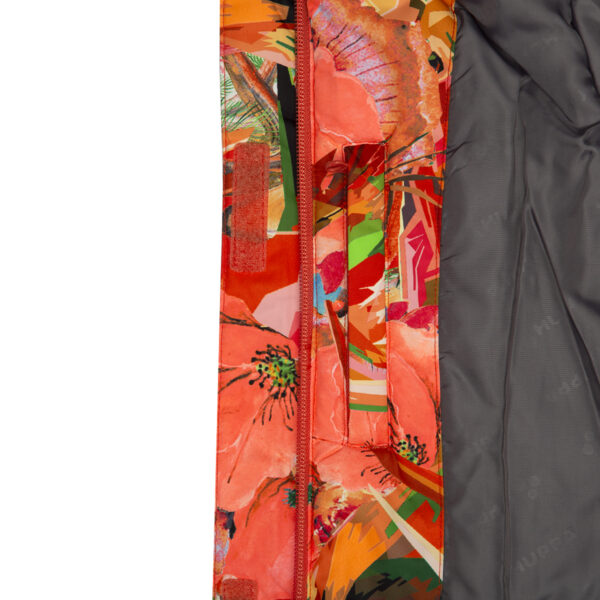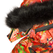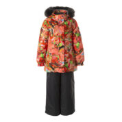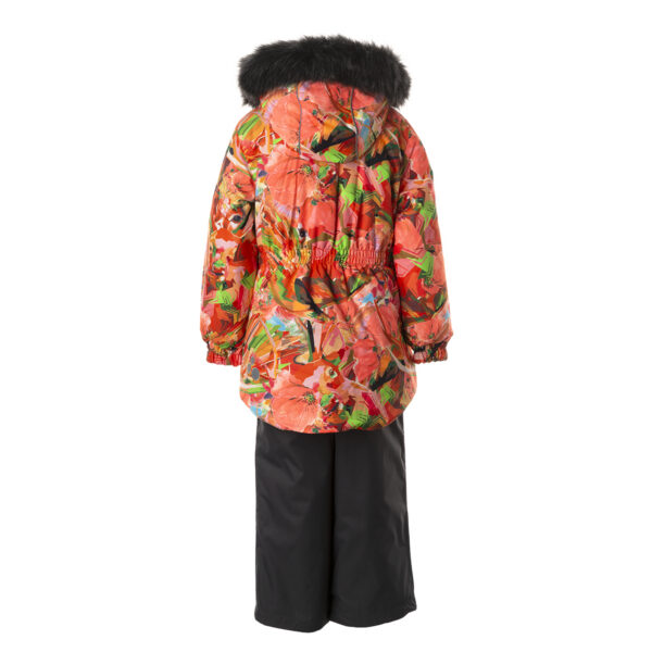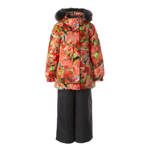 Children’s jacket and pants set. Waterproof and windproof, breathable top fabric. Soft mesh lining on the inside of the jacket and pants. Integrated elastic band at sleeve ends and on the waist. Removable snap-on hood. Removable faux fur trim on hood. The pants have removable elastic and adjustable braces. Integrated elastic band on waist. Snow gaiters at leg ends. Drawstring tunnel with stoppers at leg ends. Waterproof taped seams. Reflective elements on both jacket and pants.