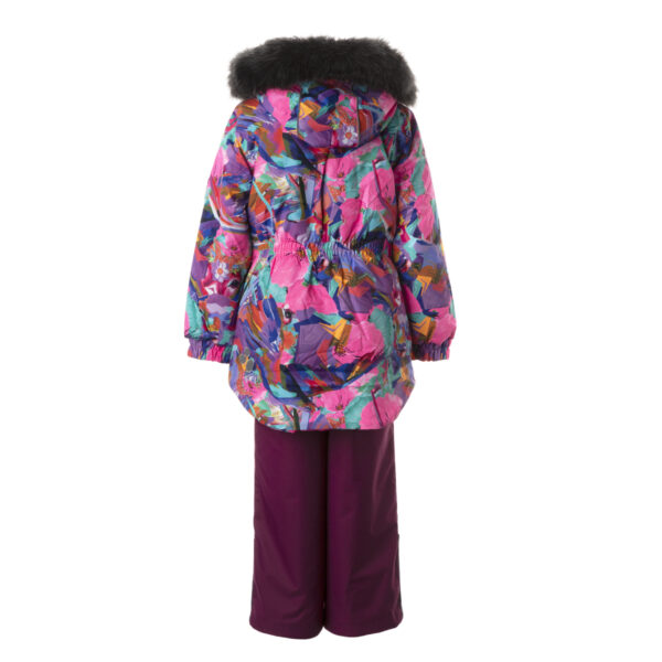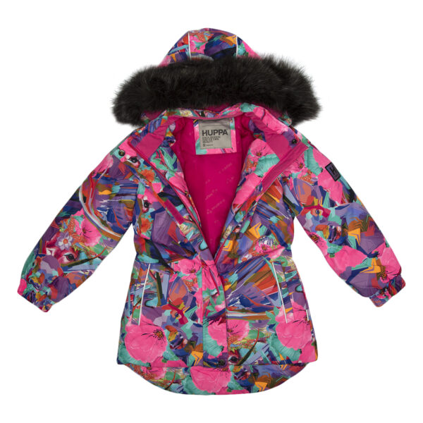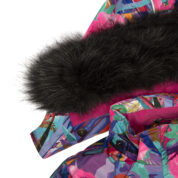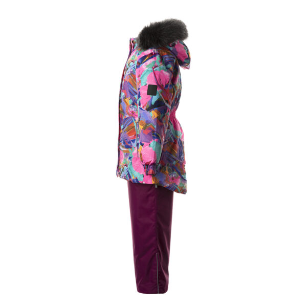 Children’s jacket and pants set. Waterproof and windproof, breathable top fabric. Soft mesh lining on the inside of the jacket and pants. Integrated elastic band at sleeve ends and on the waist. Removable snap-on hood. Removable faux fur trim on hood. The pants have removable elastic and adjustable braces. Integrated elastic band on waist. Snow gaiters at leg ends. Drawstring tunnel with stoppers at leg ends. Waterproof taped seams. Reflective elements on both jacket and pants.