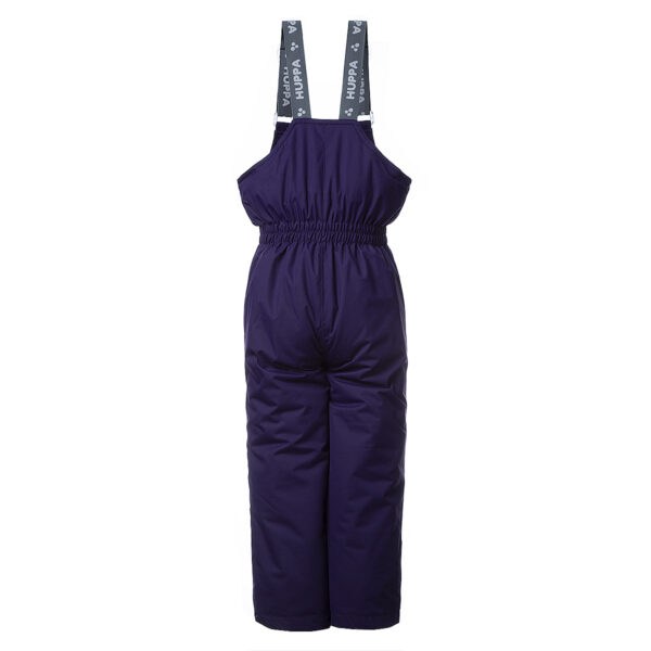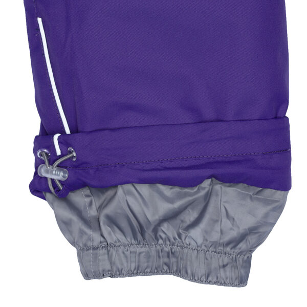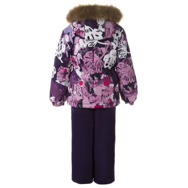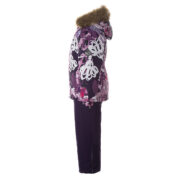 Girls´ winter set. The set has a soft taffeta and fleece lining and the outer fabric is wind and waterproof. The jacket has 300g and the trousers have 160g insulation. The trousers have a taped seat seam, a high waist, a snow guard at the leg ends and the leg ends are also covered with the outer fabric from the inside. The set has reflective details. The removable hood is attached to the collar with snaps. The trousers have adjustable elastic suspenders and an elastic band at the bottom of the leg.