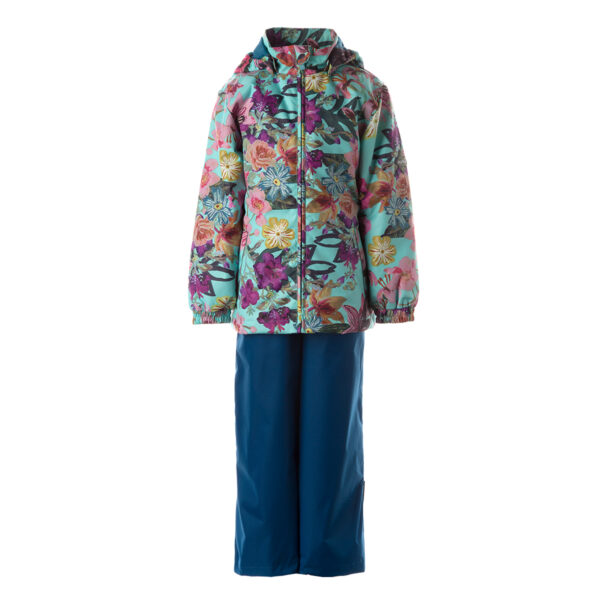 Children´s transition season jacket and pants set. Water- and windproof, breathable outer fabric. The inside of the jacket and trousers is made of soft lining fabric. Rubber band incorporated in the sleeve ends, hood edge, and back waist. The removable hood attaches to the collar with press studs. The trousers have a higher waist and adjustable elastic braces. incorporated rubber waistband. Rubber band tunnel with stoppers at the ends of the legs. Waterproof taped seat seam. The pants have no inseam on the leg. Both jackets and trousers have reflective details.