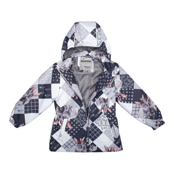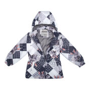 Children´s transition season jacket and pants set. Water- and windproof, breathable outer fabric. The inside of the jacket and trousers is made of soft lining fabric. Rubber band incorporated in the sleeve ends, hood edge, and back waist. The removable hood attaches to the collar with press studs. The trousers have a higher waist and adjustable elastic braces. incorporated rubber waistband. Rubber band tunnel with stoppers at the ends of the legs. Waterproof taped seat seam. The pants have no inseam on the leg. Both jackets and trousers have reflective details.