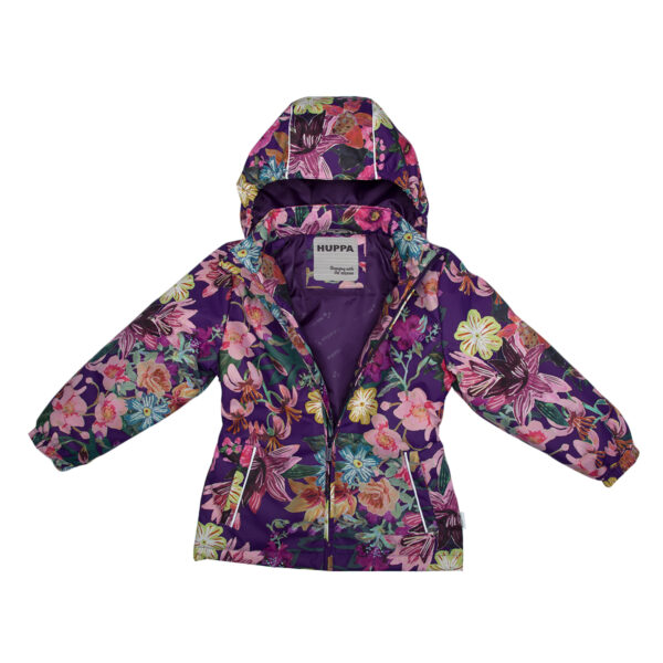 Children´s transition season jacket and pants set. Water- and windproof, breathable outer fabric. The inside of the jacket and trousers is made of soft lining fabric. Rubber band incorporated in the sleeve ends, hood edge, and back waist. The removable hood attaches to the collar with press studs. The trousers have a higher waist and adjustable elastic braces. incorporated rubber waistband. Rubber band tunnel with stoppers at the ends of the legs. Waterproof taped seat seam. The pants have no inseam on the leg. Both jackets and trousers have reflective details.