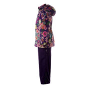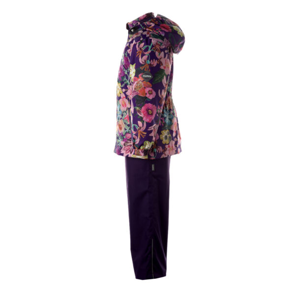 Children´s transition season jacket and pants set. Water- and windproof, breathable outer fabric. The inside of the jacket and trousers is made of soft lining fabric. Rubber band incorporated in the sleeve ends, hood edge, and back waist. The removable hood attaches to the collar with press studs. The trousers have a higher waist and adjustable elastic braces. incorporated rubber waistband. Rubber band tunnel with stoppers at the ends of the legs. Waterproof taped seat seam. The pants have no inseam on the leg. Both jackets and trousers have reflective details.