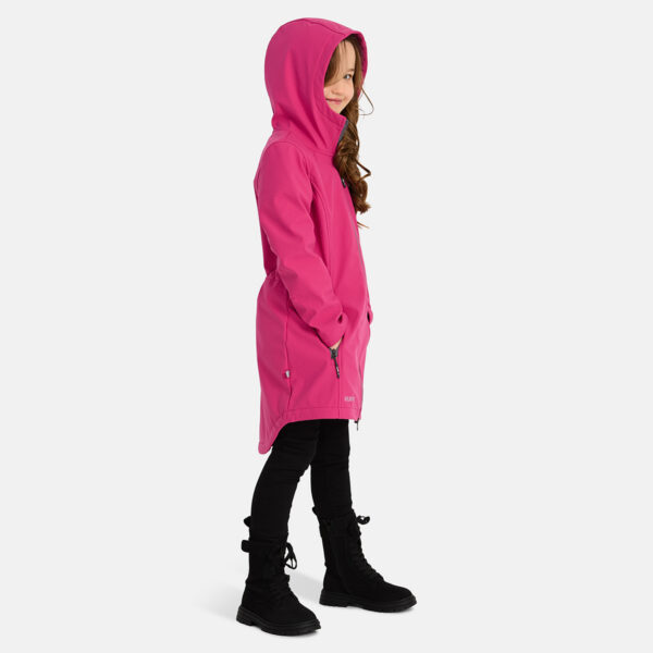 Kids’ windproof Softshell coat. The coat is decorated with a dotted reflective pattern. Brushed soft fabric on the inside. Adjustable waist with stoppers.