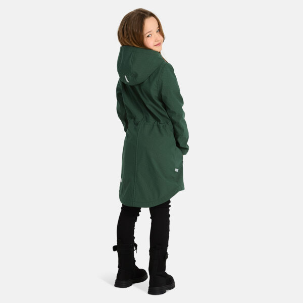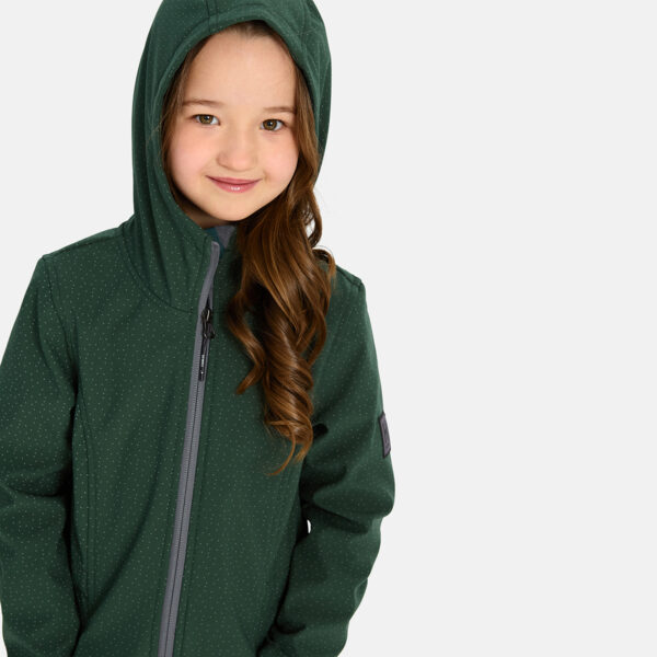 Children´s windproof Softshell coat. The coat has a dotted reflective pattern and an inner lining made of a brushed soft material. Rubber cord tunnel with stoppers on the waistband. Two-way zip fastening.