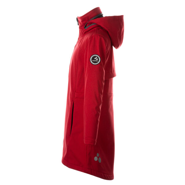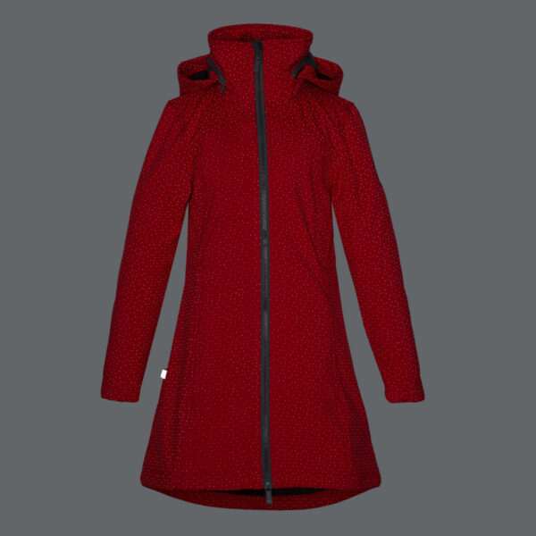 Girls´ windproof Softshell coat. The jacket has a dotted reflective pattern and an inner lining made of a brushed soft material. The hood can be set inside the collar. It has adjustable waist with stoppers.