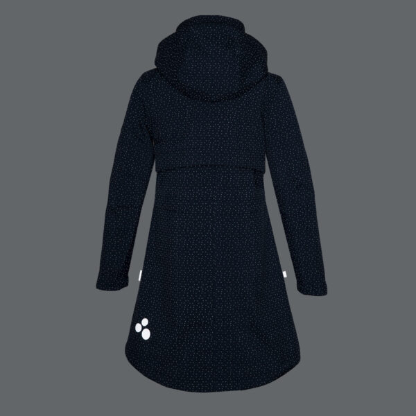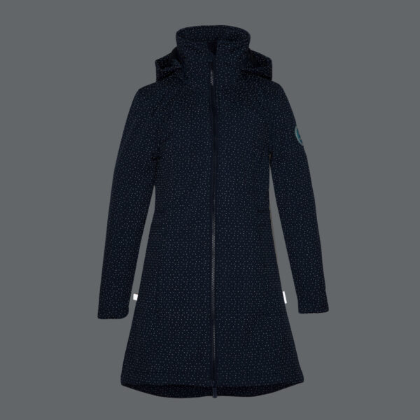Vaikiškas neperpučiamas paltas iš Softshell audinio. Viršutinėje pusėje taškinis šviesą atspindintis raštas. Palto vidinė pusė yra minkšta. Į apykaklę įleidžiamas gobtuvas. Įsiūtos kišenės su užtrauktuku. Juosmenyje įsiūta guminė juostelė su fiksatoriais.