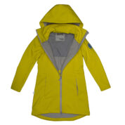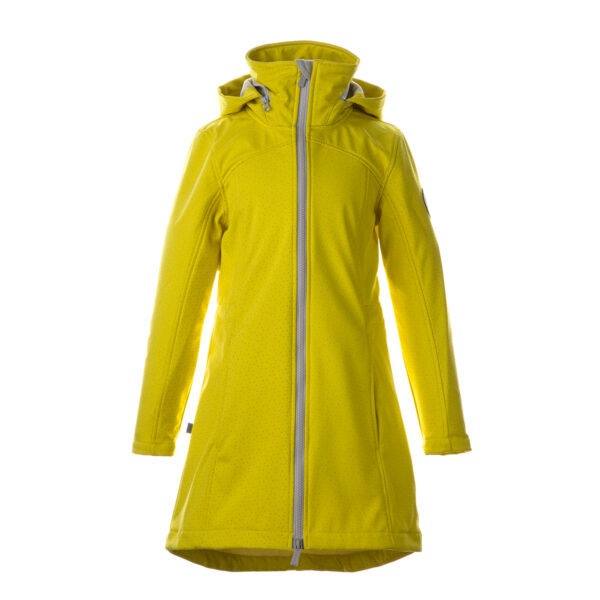Bērnu vēja necaurlaidīgs mētelis no Softshell auduma Punktota, atstarojoša auduma virspuse Mīksta mēteļa odere Stāvapkakles iekšpusē piestiprināma kapuce Aizdarāmas kabatas Vidukļa līnijā rāvējslēdzējs ar stoperi