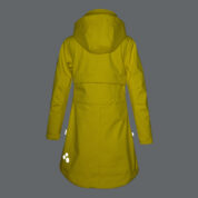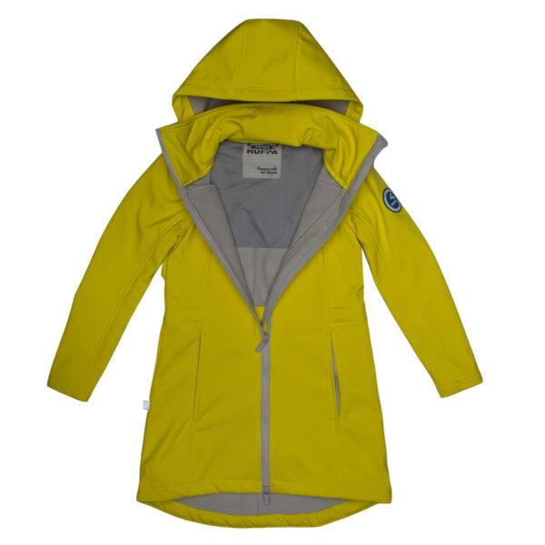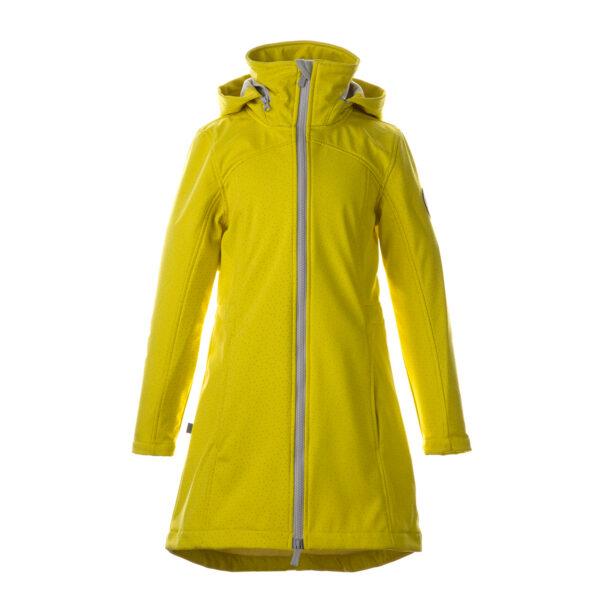 Girls´ windproof Softshell coat. The jacket has a dotted reflective pattern and an inner lining made of a brushed soft material. The hood can be set inside the collar. It has adjustable waist with stoppers.