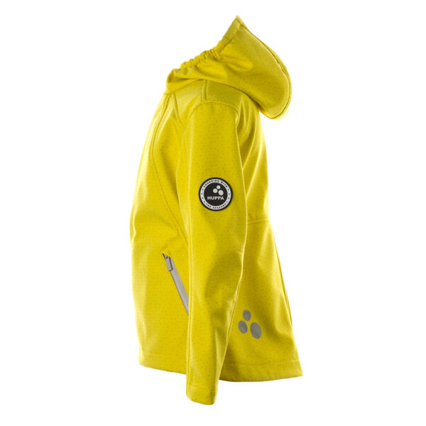 Children´s windproof jacket made of Softshell fabric. Reflective polka dot print on the top. Soft inside of the jacket. Elasticated drawstring at the edge of the hood.