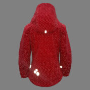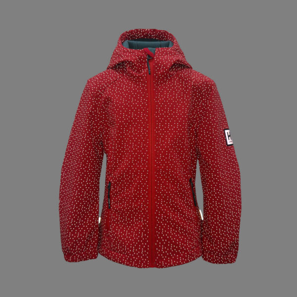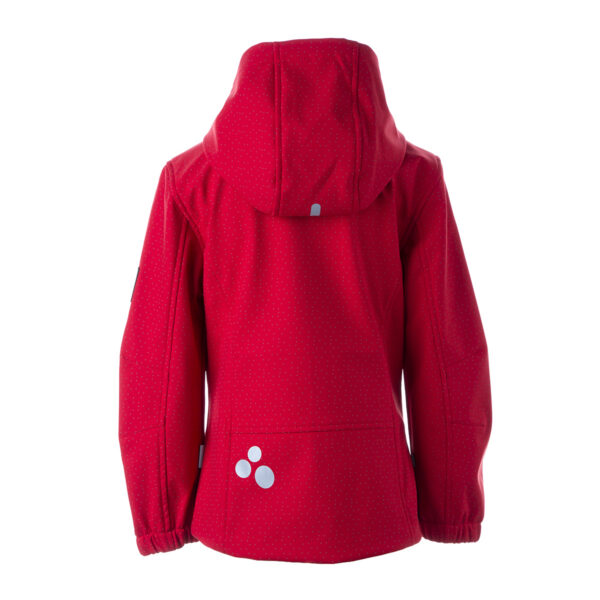 Girls´ windproof Softshell jacket. The jacket has a dotted reflective pattern and an inner lining made of a brushed soft material. It also has an elasticated hood.