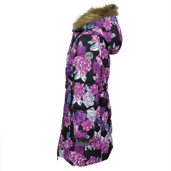 Children’s waterproof and windproof winter coat Breathable fabric Soft lining on the inside Removable snap-on hood Ribbed cuffs at sleeve ends Two-way zipper at front Faux fur trim on hood Reflective elements on fabric