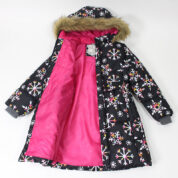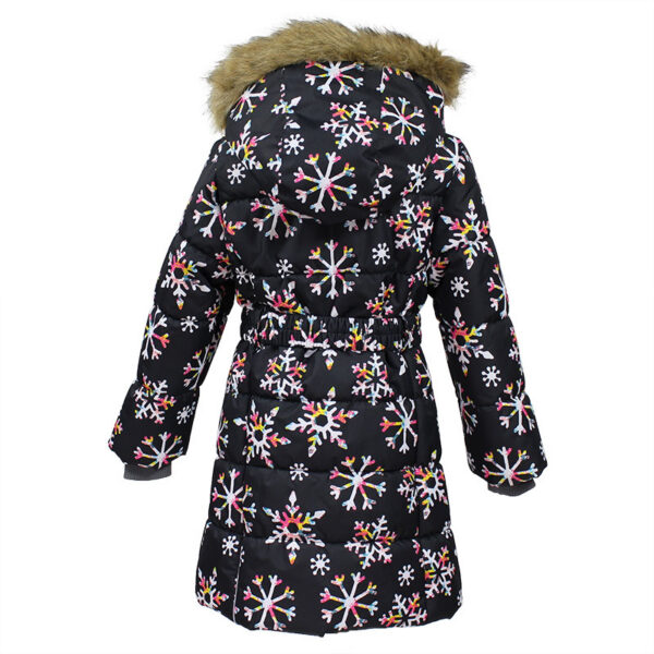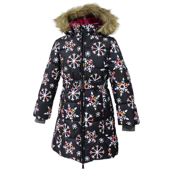 Children’s waterproof and windproof winter coat Breathable fabric Soft lining on the inside Removable snap-on hood Ribbed cuffs at sleeve ends Two-way zipper at front Faux fur trim on hood Reflective elements on fabric